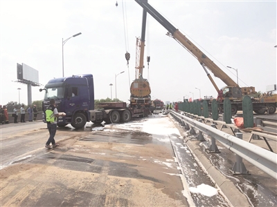 “现场还有一些汽油遗撒到了桥下的路面上,由于受所在位置的限制,无法使用大型收运工具,只能采用传统的人工清理方法。”王钧说,现场的队员们顶着炎炎烈日,将清理后的废物一桶一桶地往上提,衣服也是湿了一遍又一遍。