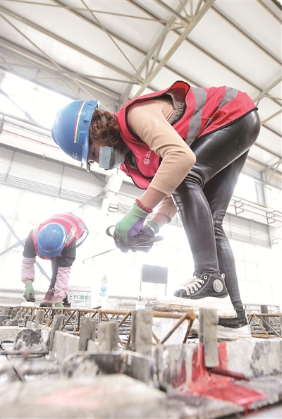 3月4日,记者走进生产装配式预制构件的车间,轰鸣的机器声中,有节奏地迸发出切断钢筋瞬间发出的脆亮响声。冒着白色热浪的蒸养窑正在为刚刚浇筑的预制板做养护,身穿红色反光背心的女工和男工一道,井然有序地作业着。