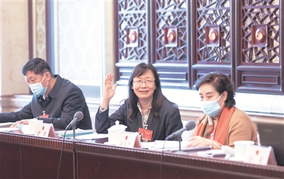 昨天上午,十三届全国人大四次会议北京代表团召开代表小组会议,审议全国人大常委会工作报告。图为伊彤代表举手发言。北京市人大常委会供图