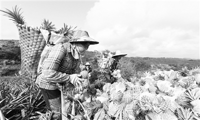3月10日,在万宁市龙滚镇凤园村,工人将采收的菠萝集中堆放。近日,海南省万宁市迎来菠萝采收季,本地企业、农户积极组织工人采收菠萝,田间地头一派繁忙景象。 新华社发