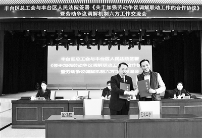 据了解,近年来,丰台区法院受理的劳动争议案件数量呈逐年上升趋势,案件类型日趋丰富,呈现出劳动者岗位身份多元化、诉求类型多元化、纠纷产生原因多元化的特征。在劳动争议案件审理方面,存在劳动者和用人单位对抗逐渐上升调解意愿相对降低、多种诉求交织重叠导致案件复杂程度和处理难度加大、当前群体性纠纷呈高发态势化解难度较高的情况。本次丰台区法院和区总工会签订合作协议,实现了工会和法院在解决劳动争议案件方面的强强联合,“工会+法院”诉调对接机制可以发挥各自优势,加强衔接配合,使更多劳动争议案件通过诉前调解方式快速化解,实现从源头上减少诉讼增量的目标任务,充分发挥劳动争议调解联动机制在构建和谐劳动关系、维护社会稳定中的重要作用。同时,有力强化了该区协调劳动关系的六方联动机制。