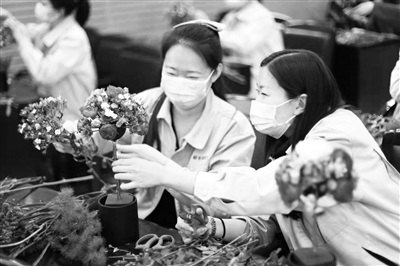 本报讯(记者 曹海英)“你的这个形状圆,颜色搭配也好看。”这是日前北京建工一建公司工会举办的女职工艺术插花活动中的一幕。