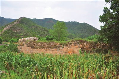 城堡并非方形,而是依山势而建,与谷相连,城墙一直建到山上,查阅光绪《昌平州志》:横岭城“南北当两山之冲,长五百余丈。”城墙如此之长。城堡还有特殊,分先后两次建成,“明弘治十八年建北城垣,其南面城垣正德八年建”,之间相隔八九年,可能有经济原因,也可能与这里的地形特殊有关,还可能分先后两次构思等等。查看地图,横岭城与邻近的长峪城、镇边城形成三角,而横岭城堡正处在三角形的最北端,当时正是边关的最前沿。《长安客话》写道:“横岭城与长峪城相偪近,然横岭尤孤悬外界。”《畿辅通志》说,此地“当居庸之西北,亦要路”,如何防御敌人,这是国家头等大事,所以早于北面长城,修建了横岭城,起到了阻挡作用。站在城里,看着山上断续蜿蜒的城墙,横跨沟壑,古人利用地势,想出这种特殊形式,有着宏大气魄。城堡建得巨大,独立战争前沿,威严挺立,有如山岭,横亘面前,定然震撼,别说打仗,走到跟前也会望而生畏,能无强悍。