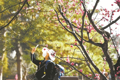 随着气温回升,北京街头的各种花卉竞相绽放,美不胜收。图为游客在中山公园拍摄盛开的梅花。
