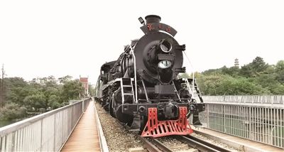 现在,铁路桥上停着一列退役的绿皮火车,车头是一个老式的上游型蒸汽机车,是铁道部唐山机车车辆厂1983年制造的,这种机车头曾经是我国铁路运输的主力,在1960年到1999年的30多年中,一共生产了1820台。