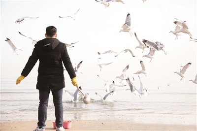 阳春三月,海鸥聚集烟台第一海水浴场,与人们共享晨光。浴场管理员把新鲜的海鱼抛向大海,海鸥们飞至岸边取食,丝毫不怕人类,海鸥争食的场景成为一道独特风景。
