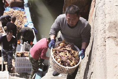 近日,当地部分养殖区海星泛滥引起广泛关注,海洋渔业部门已采取打捞等措施减轻海星“侵袭”对近海养殖户的影响。图为山东省青岛市胶州湾养殖区的渔民将打捞的海星搬运上岸。