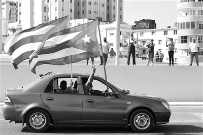 由几百名古巴民众组成的车队3月28日在首都哈瓦那举行游行,要求美国结束对古巴近60年封锁。图为人们手举古巴国旗在古巴哈瓦那参加游行。