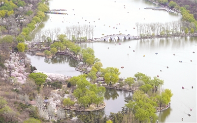 3月30日,北京市气象台发布消息,今年北京已于3月22日正式入春,较常年(1981—2010年平均)入春时间(3月30日)提前8天。图为游人在玉渊潭公园赏樱。