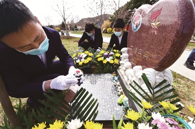 3月30日,河北省三河市的灵山宝塔陵园职工代表,在北京女孩“丹丹”的墓碑前鞠躬献花。“丹丹”本名叫张思扬,于2015年1月5日凌晨突发疾病不幸离开人世。父母为了完成她的愿望,签署了器官捐献协议,进行了2015年度北京首例公民死亡后的器官捐献。