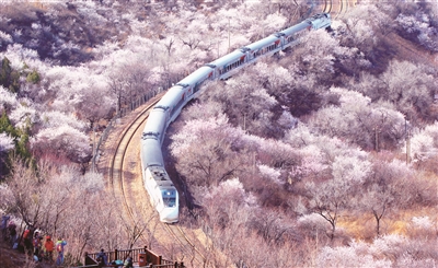 北京的郊区多山,且不乏高峻的大山。这个时节,那里已经成了山桃花的海洋。所谓山花烂漫,说的就是北京郊区漫山遍野的山桃花吧,这种花开得任性,开得恣肆,即使在风雨天,也不曾影响它矫健地怒放。在八达岭居庸关拥着奔向远方的动车,人们的心情也随之飞向远方。