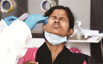 4月6日,一名女子在印度比哈尔邦巴特那接受新冠病毒检测。印度近期疫情持续反弹,新增病例激增,5日单日新增确诊病例超10万例。据印度卫生部6日发布的疫情数据,印度全国累计确诊病例已达12686049例。 新华社发