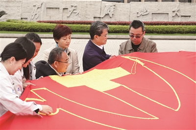 来自当地政府部门、建设监理单位的代表与北京建工路桥集团党员干部职工们一起,在长10米、宽6.7米的党旗上绣下自己的一针一线。