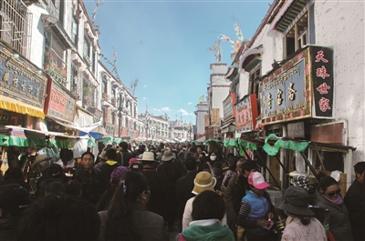 拉萨的八廓街从字面上理解,似与“八”有关,好像有八条街道或有八个角,因为另有名字就叫八角街。其实,街与“八”并无联系。街只有四条:八廓东街、八廓西街、八廓南街和八廓北街,四条街不是笔直的,街与街相连处不是九十度直角,也非四十五度斜角而成八个角,有的位置甚至自然地弧形转过去,准确地说应是多边形环状街道。