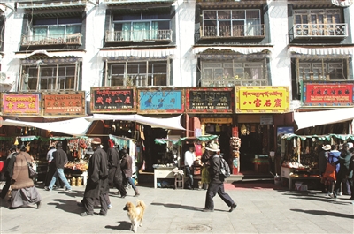 八廓街上遗存着许多名胜古迹,有下密院、印经院、席德寺废墟等,能看到保留有老式藏房建筑。拐进八廓北街的一所院子,有一幢看起来普通的两层小楼,名叫曲结颇章,这就是赫赫有名的法王宫。它是在修建大昭寺之前,松赞干布为自己建造的简朴“行宫”,古老而珍贵。还有一幢三层楼房,顶层为红色草墙,这是当年清朝驻藏大臣衙门。雍正年间,开始向西藏派遣驻藏大臣,之后清朝的100多年间,共派遣了84任,可见藏汉关系久远而紧密。