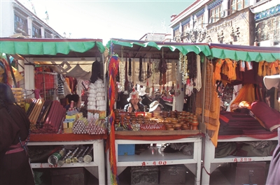 八廓街转一周,又回到大昭寺门前。街面开阔,是个小广场,进出八廓街的人流汇集于此。两边依然是店铺,前面的活动摊位整齐地排列开来。八廓街里传统商品居多,而这里以藏族特色的饰品、纪念品、现代工艺品见长,分类整齐。丝绳编织物鲜艳的色彩吸引了视线,有中国结、动物、花卉等,品种繁多,不知如何是好。忽见一种,上面呈现出点点鲜艳色彩,很别致。主人热情介绍说,这叫格桑花。多好的名字,太形象了,这是西藏最美的花,也是最好的纪念,何况在八廓街上。
