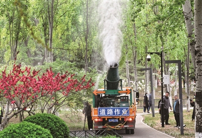 4月11日,在五棵松公园,园林绿化工人将多余的树枝锯伐后,专业的园林车辆向杨柳树喷洒出雾状水汽,以降低杨柳飞絮的传播量。记者从市园林绿化局了解到,随着天气的逐渐转暖,本周末北京进入了第一次杨柳飞絮高发期。全市将聚焦重点区域和重点时段,通过多种措施开展精准治理,降低飞絮对市民生活的影响。