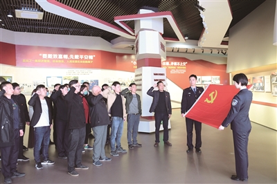 4月11日,参观者在枫桥经验陈列馆重温入党誓词。当日,浙江诸暨枫桥镇魏廉村79岁老党员魏杏根来到枫桥经验陈列馆,与20名年轻党员一起重温“枫桥经验”发展历程。参观后,魏杏根老人还与大家分享了当年自己运用“枫桥经验”化解基层矛盾的故事。