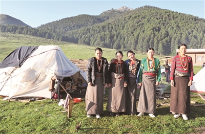 我们当中有一位姑娘很受她们喜爱,于是她们就把藏族服装让姑娘穿上,“呀!真好看,就当我妹子吧。”一位藏族大姐说,“那太好啦!”姑娘答应着。随后藏族妇女拉着姑娘跳起舞,唱起歌……这个早晨大家都很开心。