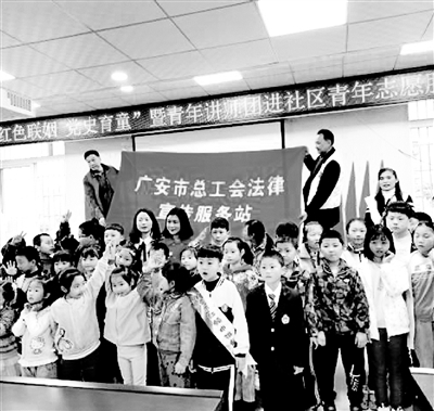 4月10日上午,四川广安市总工会与共青团广安市委、广安市义务工作者联合会走进广安市广安区枣山街道滴水岩社区开展关爱农民工子女“守护未来·法治护航——送法进社区系列法治讲座”。(4月17日《四川工人日报》)