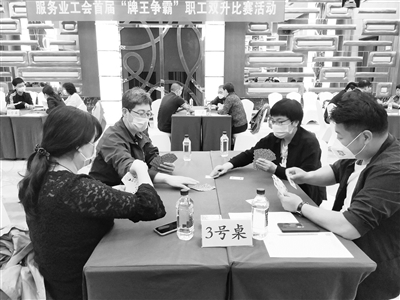 近日,朝阳区服务业工会举办首届“牌王争霸”职工双升比赛,基层工会通过层层预赛,选拔出16支代表队32名职工参赛。相关负责人表示,希望通过此次比赛,为职工棋牌爱好者搭建交流、切磋、展示的平台,丰富广大职工的业余文化生活,增强工会组织凝聚力。