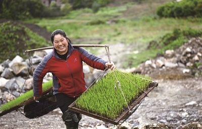 4月19日,贵州省黔南布依族苗族自治州福泉市凤山镇羊昌河村的村民在运送秧苗。