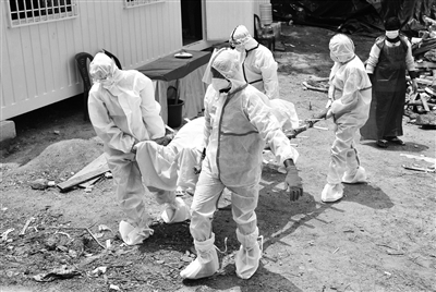 印度卫生部27日发表声明说,为了解决氧气罐车短缺的问题,政府已进口了20台低温氧气罐车分配给各邦使用。图为4月26日,工作人员在印度城市班加罗尔搬运新冠死者的遗体。