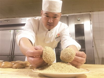 除了在比赛中进行创新,日常工作中,谢小虎也会根据顾客需求,改良产品。“我们店里卖得最好的面点是芝麻烧饼。这个烧饼还在北京的餐饮比赛中获得过金奖。制作的手艺也是一代代传承下来的。最近几年,很多顾客反映,觉得烧饼有点甜。于是,我们从口感和健康角度考虑。对制作烧饼使用的酱进行了调整。这个酱是由芝麻酱和花生酱调制而成的。以前,两者的比例是2:8,现在,改成了5:5。芝麻烧饼的甜度降低了,香味却增加了,大家都反映不错。”