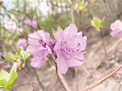 从山谷往上走,又发现了数丛杜鹃花。它们与南方的扎堆式开花不同,虽然几棵树离得不算远,但毕竟是独立的,而且姿态也各异,它们在这山野中各自保持着自己的情态。从数量上说,这稀疏的几群,与南方的漫山遍野是无法相比的,但是,这几丛曼妙的野杜鹃,已经足够慰藉我们的心灵。小伙伴赶紧在微信上发朋友圈说——“不虚此行”。