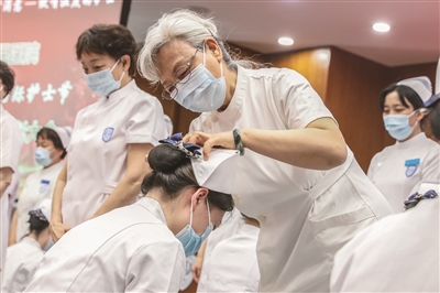 近日,北京大学人民医院的护理届前辈闫凤玲(中)为新入职护士授帽。当日,北京大学人民医院和中日友好医院举办护士节庆祝和表彰活动,迎接5月12日到来的第110个国际护士节。