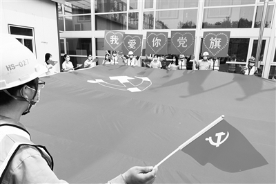 昨天,在中建一局集团建设发展有限公司北京大兴机场安置房项目,百名建设者齐聚于此。当天,由市总工会主办的 “首都职工心向党 同心接力绣党旗”活动在安置房项目举行。现场,全体党员面对鲜红的党旗重温入党誓词,随后,职工们同心接力一针一线绣制党旗,表达对党的热爱之情。本报记者 邱勇 摄影报道