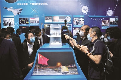 5月24日,人们在参观展出的月球土壤。当日,“众心向党 自立自强——党领导下的科学家”主题展在中国国家博物馆开幕。展览共分6个部分和1个专题,围绕“众心向党 自立自强”主题,以中国共产党的坚强领导和伟大指引为主线,用260余张图片、190件套实物和11个多媒体的形式,将“两弹一星”精神、西迁精神、载人航天精神、抗疫精神、探月精神等源于科技界的革命精神贯穿在一起。