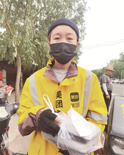 “您好,我这边是送外卖的,有您的外卖!”下午4点,记者叫了一份外卖,很快,不到半个小时,一名外卖配送员给记者打了电话,记者赶紧出来,看到一个瘦瘦高高的姑娘拎着外卖走过来。她看起来清清爽爽,说明采访的意图后,这个外卖员很友好同意了。我们一边走,一边聊。她叫王凤,出生于1991年,老家在黑龙江大庆,来北京送外卖一年了,早上6点打卡,系统派单后,就开始出来送外卖。