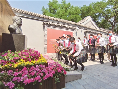 在中国共产党成立100周年之际,6月1日,中国共产党早期北京革命活动旧址正式面向社会公众开放。图为北京学生代表为李大钊塑像献花。