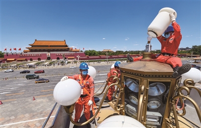 昨天,国网北京电力城市照明管理中心华灯班对天安门广场华灯“体检”进入收尾阶段。至此,华灯班已完成天安门广场和长安街253基华灯、6000多盏光源的“体检”工作,以崭新的面貌喜迎建党百年。