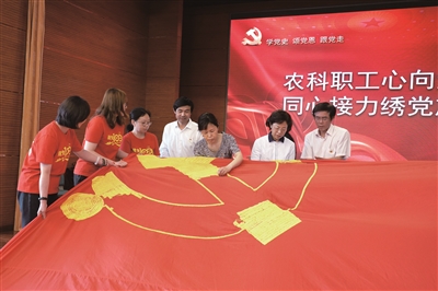 为庆祝中国共产党成立100周年,北京市农林科学院工会按照市总工会和院党组的要求,5月20日,在院职工之家举行了“农科职工心向党、同心接力绣党旗”活动启动仪式。经过15个基层单位的接力,于近日完成巨幅党旗的传递绣制,进一步凝聚全院党员职工的爱党爱国爱院爱所情怀。