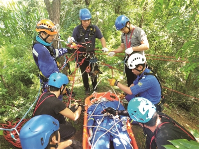 国鑫在蓝天救援队中使用的ID名字是“迷彩诱惑”,这是缘于他最钟情、最难以忘怀的那一身迷彩戎装。虽说当过5年的消防兵,但所学的技术与救援体系略有不同,为了提升自己的救援能力,他认真学习钻研院外急救、山野救援、水域救援和绳索救援技术,多次外出自费学习绳索技术。“用我们的话说就是掉进‘绳坑’里了,没事就自己钻研、练习,学会了之后还能教给其他队友。”国鑫笑着说。