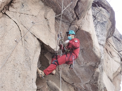同样让国鑫印象深刻的还有黄柏寺驴友坠崖的救援经历。2020年1月18日傍晚5点左右,延庆蓝天救援队接到了区相关部门的求助电话,说有两名30多岁的游客在张山营镇黄柏寺村附近坠崖,经参加现场救援的延庆消防支队的人员判断,其中一名男子已经不幸坠崖去世,另一名女游客被卡在30多米高的山崖夹缝中,需要延庆蓝天救援队提供绳索救援技术支持。