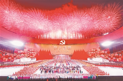 随着激昂深情的歌声响起,绚烂的焰火升腾出“100”的纪年,盛放在国家体育场上空。舞台上,点点星火汇聚成党徽的图案,拉开演出帷幕。