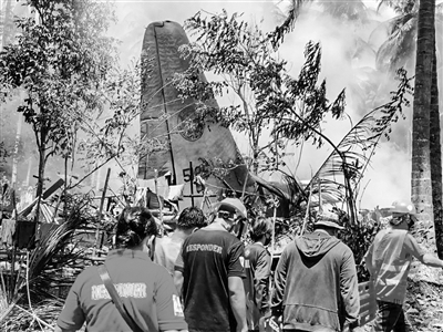 现场照片显示,飞机坠毁地点黑烟滚滚。索贝哈纳说,获救人员已被送往苏禄省第十一步兵师医院接受治疗,当地军方指挥官威廉·冈萨雷斯正在现场指挥搜救。图为7月4日,人们在菲律宾苏禄省的军机坠毁现场参与救援。