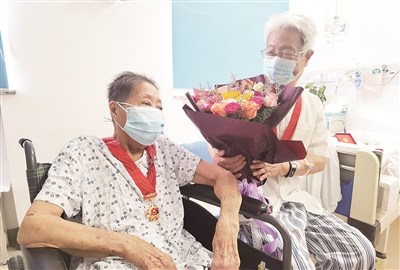 拿到勋章的窦爷爷记挂着住在脑病脾胃科的秋奶奶,“我一定要和老伴儿一起照张相,留下这珍贵的一刻!”为了满足窦爷爷的愿望,医务人员做好消毒,将秋奶奶推到窦爷爷的病房,俩人抚摸着胸前的纪念章,用照片定格住了这美好而神圣的一刻。