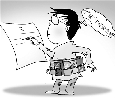 考证被不少年轻人看作职业发展中必须要做的事。近日,中国青年报社社会调查中心通过问卷网,对1515名职场人进行的一项调查显示,64.9%的受访者坦言考证是为了缓解职场压力,给自己创造更多机会;45.8%的受访者觉得是因为缺乏明确的目标,为考证而考证。(7月8日《中国青年报》)□陶小莫