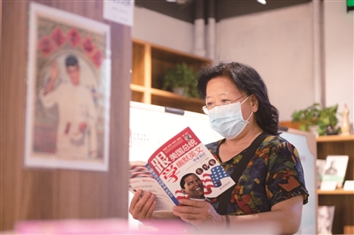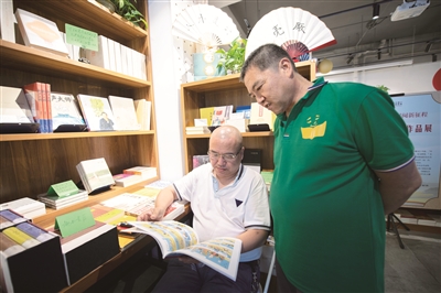 6月8日,一间外观主体为绿色的铺面在朝阳门外吉祥里108号开门迎客。上午10点,距离书店营业还有半个小时,但营业员刘忠早已开启“忙碌模式”,用消毒水喷洒着地面。另一边,营业员张海红配合着开始挥动墩布仔细擦拭地面。随后,两个人开始整理书架上的各种图书。营业前的准备工作,有条不紊的推进着。“刘师傅,十点半了,开门营业吧。”在张海红的提示下,刘忠径直走向店门,将营业提示牌转换为“开门营业”。