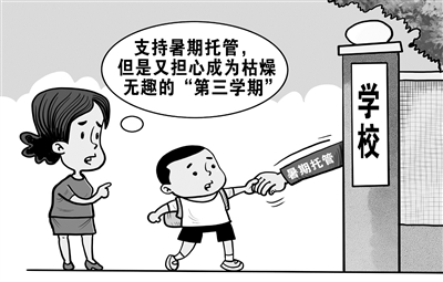 13日,教育部就探索开展暑期托管服务召开新闻通气会。就在同一天,国家卫健委也就暑期做好学生近视防控召开发布会。两个部门的两场活动,恰恰串起了家长们的喜与忧:支持暑期托管,却又担心如果托管仅仅是把孩子们继续“圈”在教室围墙之内,会让暑假成为枯燥无趣的“第三学期”,不利于孩子们的身心健康。(7月13日 新华社)