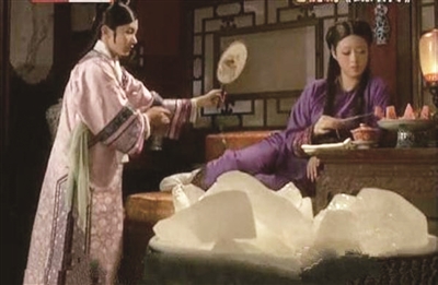 人们在冰块上会覆盖上一层厚厚的树叶,使其保持低温,防止融化。官窖有专职官吏负责采集天然冰块,贮存于冰窖中,炎夏期间取出,以供皇家和贵族使用。大家看《甄嬛传》中甄嬛怀孕被罚跪的那一集里,贵妃娘娘的旁边就放着冰块,不然贵妃娘娘也没有心情在酷热中看着甄嬛罚跪。
