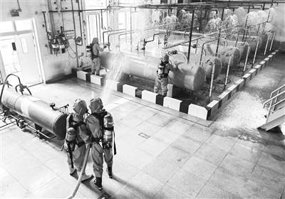 应急抢修组人员迅速穿好红色防毒衣,戴上面具,背上空气呼吸器前往液氨泄漏点进行抢修,在现场喷淋设备和消防水枪双重稀释下,迅速将泄漏的阀门修好。在设备间外,身穿黄色防毒衣的抢修人员和赶到的消防员一起用水对事故现场外围进行稀释防护。最后,环境检测组还要进入事故现场对氨浓度进行测试,确保未发生环境污染情况。