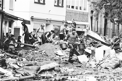 7月17日,在德国西部城镇巴特明斯特艾弗尔,人们清理洪水损毁的街道。德国警方当日说,至少133人因洪水死亡,仍有上千人下落不明。