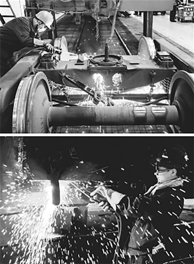 入伏以来,南京东车辆段徐州北检修车间修车库内气温平均高达40℃以上,工人在灼热的焊花和溶解后的铁屑飞溅中,汗如雨下,浸透了工装,为了“治疗”车辆“疑难杂症”,保证铁路运输安全,他们坚守在各自的岗位上。图为熔接工在对需要更换和补修的车辆配件进行切割和焊接。(7月20日《江苏工人报》)