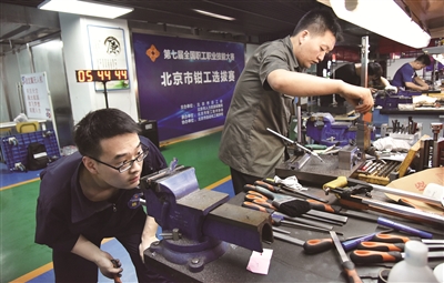 7月21日,第七届全国职工职业技能大赛北京选拔赛正式启动。本次选拔赛由北京市总工会、北京市人力资源和社会保障局等部门主办,市职工技术协会承办,包括钳工、焊工、数控机床装调维修工、工业机器人操作调整工、网络与信息安全管理员、砌筑工6个工种。图为钳工选拔赛的竞技现场。