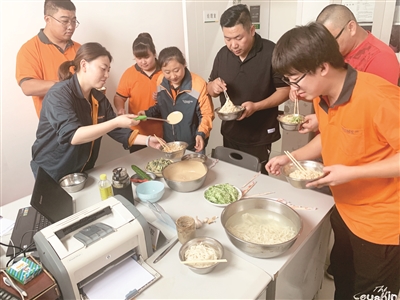 900公斤挂面、150公斤芝麻酱、500公斤黄瓜、65公斤米醋……7月21日,是“二伏”的第一天,朝阳邮政工会前一天就将这些食材发到了各网点,让职工当天吃上顺口儿的麻酱凉面。昨天中午,朝阳邮政各部门工会主席亲自下厨煮面条,让职工们轻松度伏,安心工作。本报记者 边磊 摄影报道